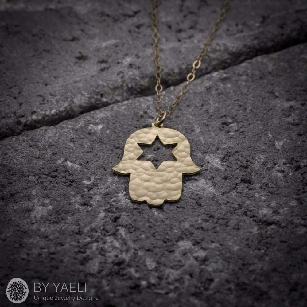 Hamsa necklace – Dainty hammered hamsa necklace with star of David hole, The PERFECT protection necklace!