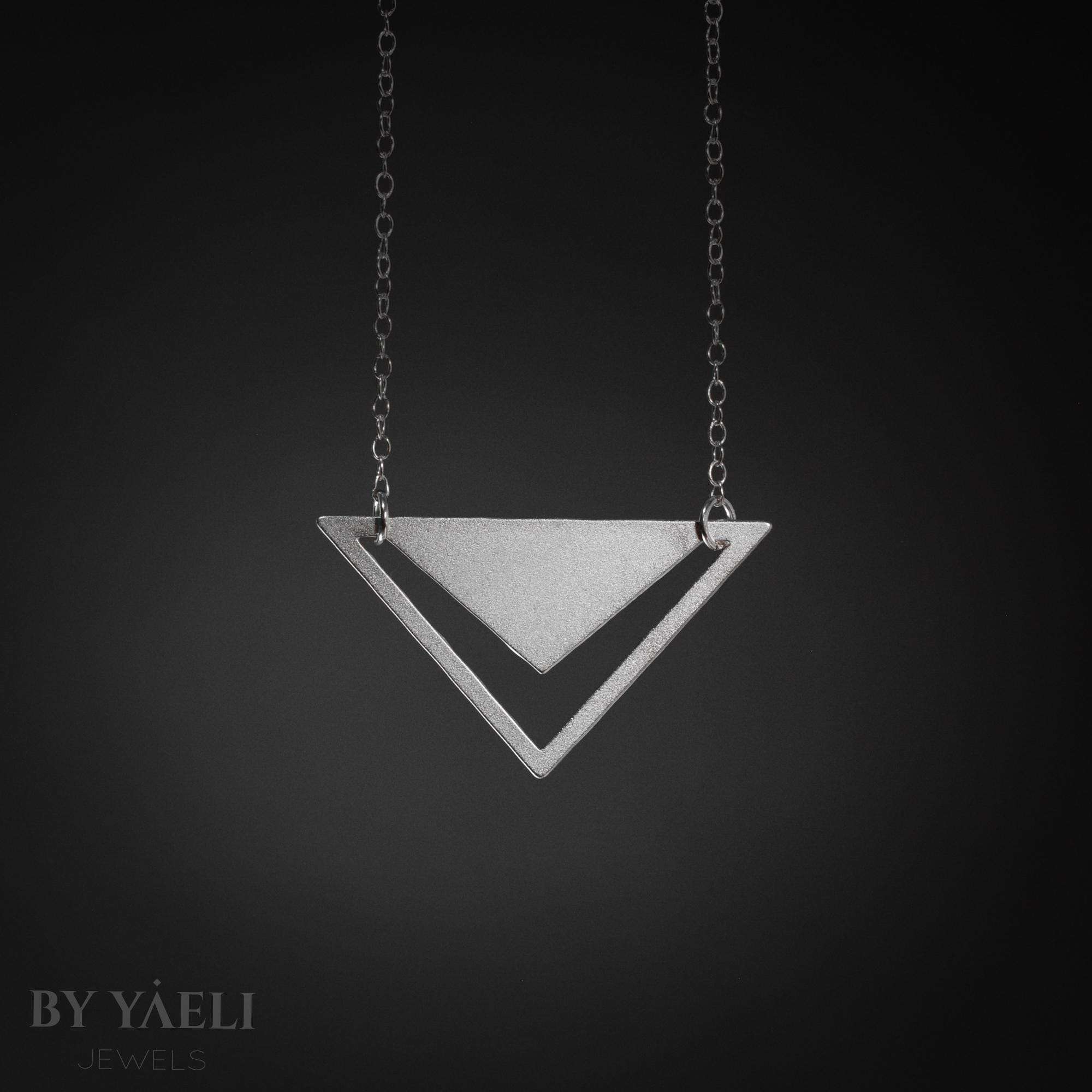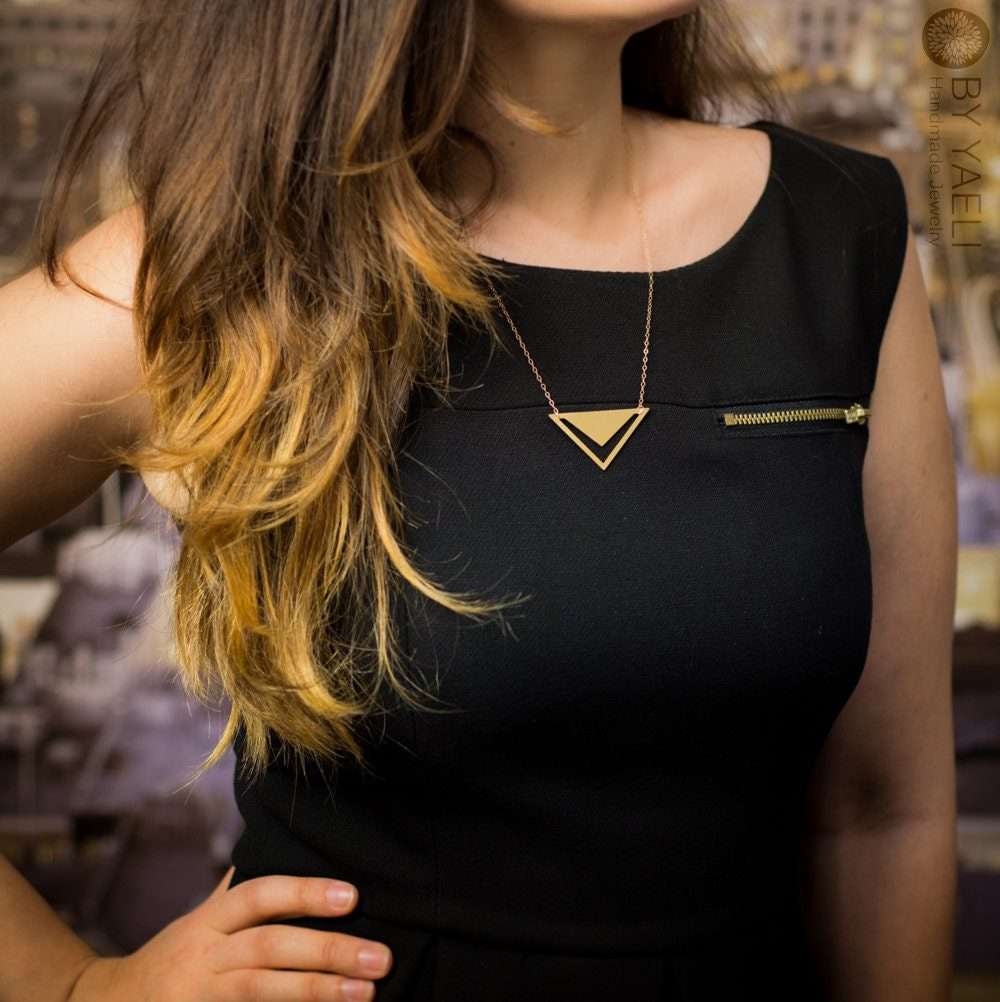 Triangle necklace – geometric triangle with V-shaped hole pendant. Featuring minimalist silhouettes.